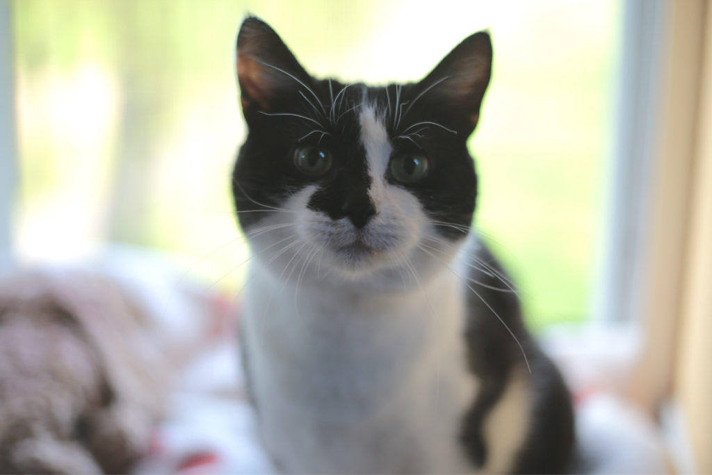 schwarz weise Katze schaut zuckersüss in die Kamera